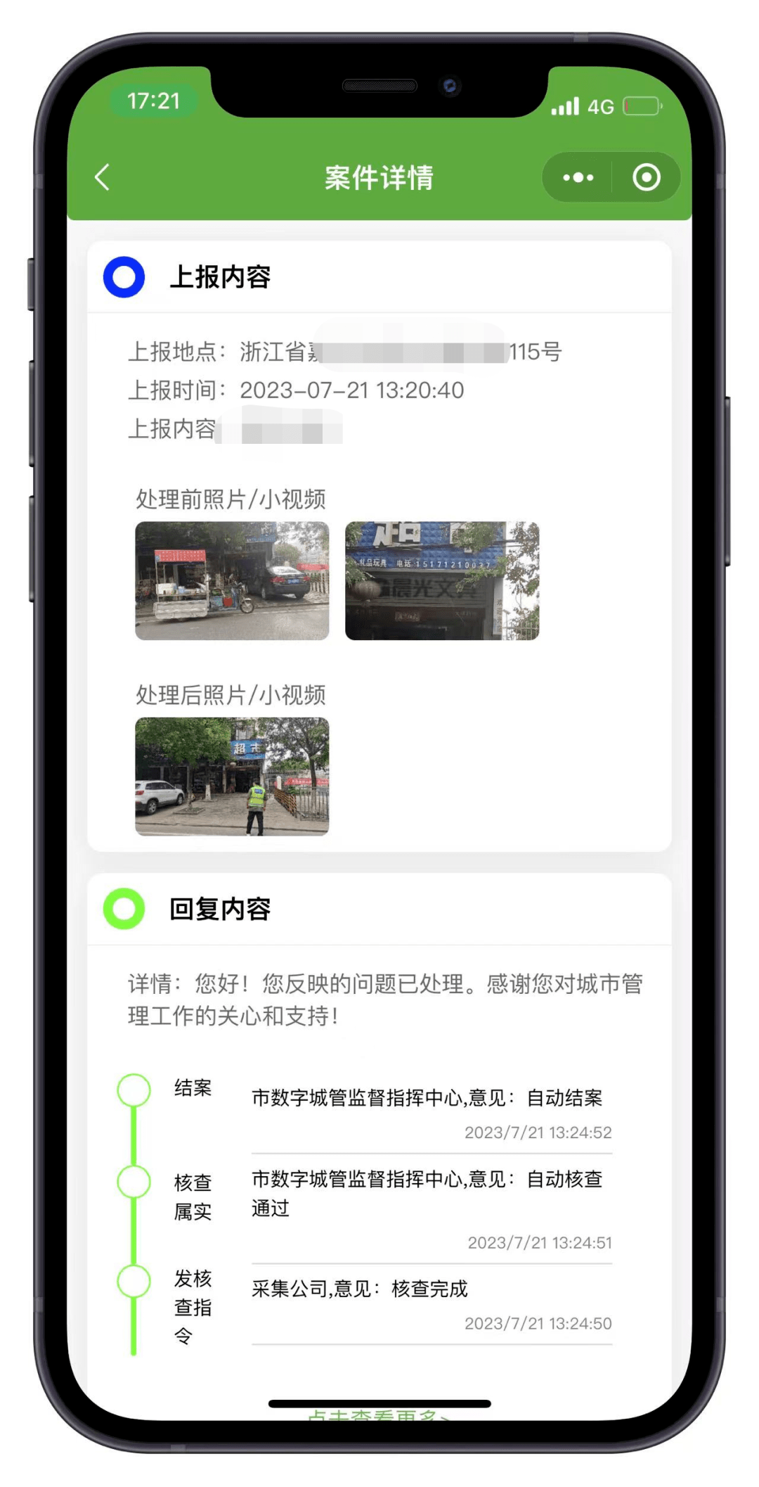 已受理的问题处理完毕后,您将会收到结案短信告知,此时可进入“请您来找茬”小程序,点击历史上报模块对问题的处理结果进行查看及评价。