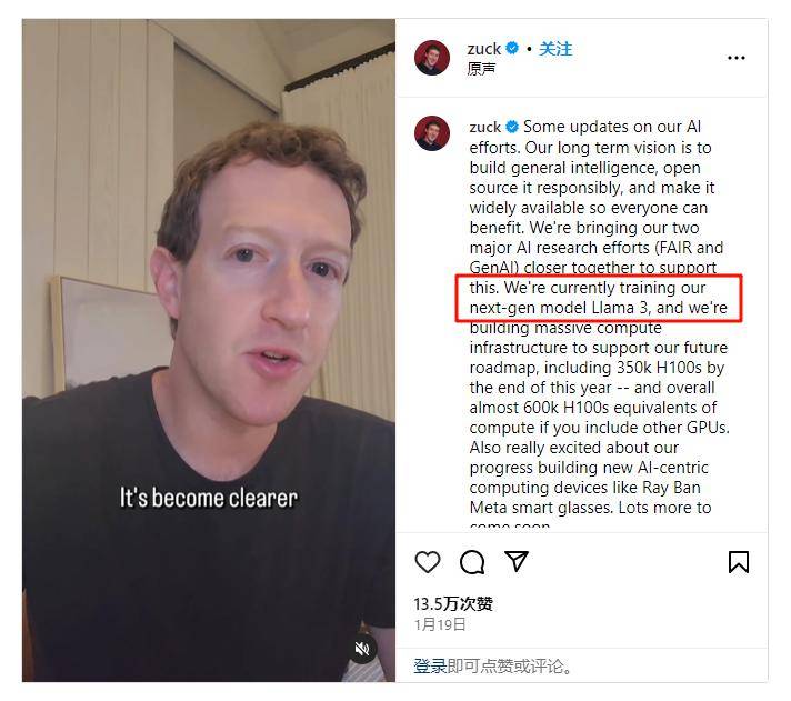 在 Instagram 视频中,小扎就表示,预计到 2024 年底,Meta 将拥有 350000 块英伟达 H100(官方定价单块 3.5 万美元,实际还在溢价),如果算上其他算力资源将达到近 600000 块 H100: