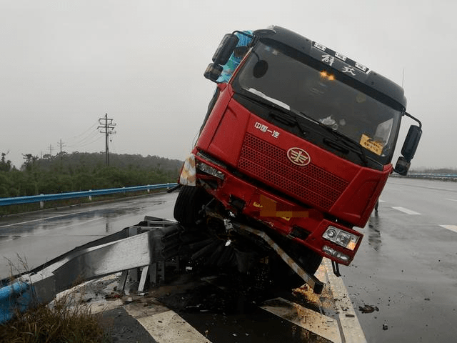 在现场发现,货车飞身骑在了中央护栏上。万幸的是,车子在高速行驶的状态下撞上了前期加装的伸缩防撞护栏上的“伸缩式防撞垫”,起到了一定的缓冲作用,帮助承受了大部分的冲击力,使得整个驾驶室受损不大,驾驶员系着安全带并未受伤。